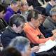People take notes as they listen to a lawyer at a gathering following a