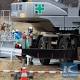 Workers are seen behind large equipment in the town of Iitate,